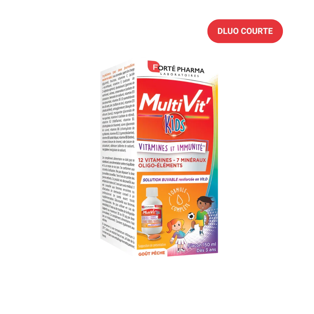 Parce qu'il n'y a pas que les grands qui ont besoin d'un coup de pouce pour rester en forme ! Multivit'Kids Solution buvable c'est notre solution multivitaminée facile à prendre dès 3 ans et au bon goût pêche.